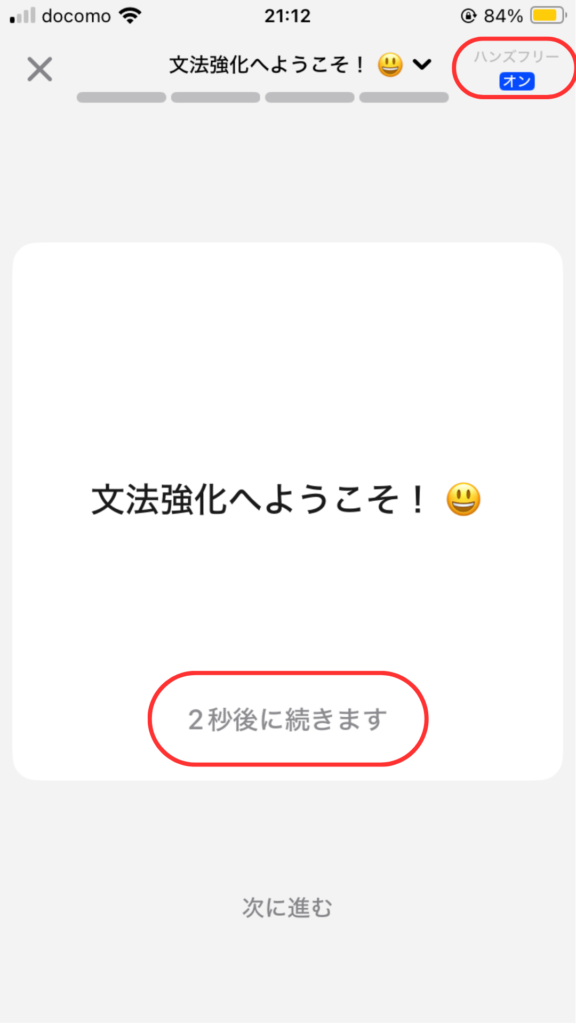 - レッスン画面で画面右上の「ハンズフリー機能」をタップしてオンにする