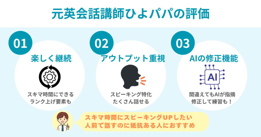スキマ時間を活用して、豊富なコンテンツで楽しくアウトプットできる口コミが多かったです。AIが会話内容を添削し、あなたの弱点に合わせて練習問題まで作ってくれるので、効率的に話す力を伸ばせます。